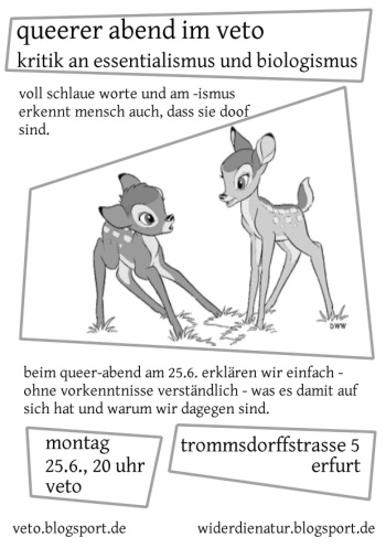 flyer In Erfurt gibt es irgendwie keinen queeren Raum. Jedenfalls nicht so, wie wir ihn uns vorstellen könnten. Normative Räume, wo mackerhaftes Verhalten willkommen ist und das Heteronormative unwidersprochen bleibt, gibt es ohne Ende. Wie lässt sich also ein anderer Raum herstellen? Z.B. im Veto… Und… Was ist eigentlich ein queerer Raum? Ist dieser sichtbar? Liegt dieser im Auge der Betrachter_in? Ist er etwas, das Menschen tun? Etwas, das gut vorbereitet sein muss? Ist er beweglich? Braucht er eine bestimmte Umgebung? Ist es wichtig, wo er sich positioniert? Und wer positioniert eigentlich was? Und mit welcher Absicht? Handelt es sich um eine Strategie? Eine Denkbewegung? Mit festgelegten Normen? Und möglichst viel Glitzer? Oder ist ein queerer Raum der Schritt ins Ungewisse?