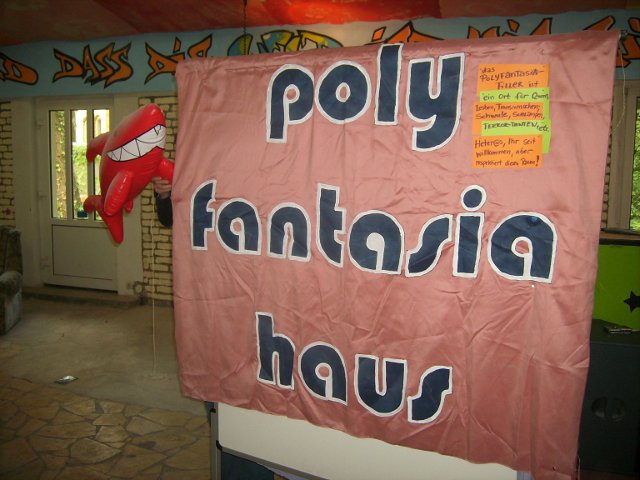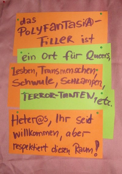 Wir meinen das ernst. Wir wollen nicht, dass bei der Polyfantasiawoche eine mackermäßige Stimmung herrscht, wie mensch sie auch in jeder Kneipe haben kann. Eine Stimmung, die oft dazu führt, dass Leute, die diese Stimmung nervt, gehen oder erst gar nicht kommen. Heterosexuelle und Männer sind willkommen, wenn sie es aushalten, sich ausnahmsweise mal nicht in den Mittelpunkt zu stellen. Wer das nicht schafft, bleibt besser zuhause.